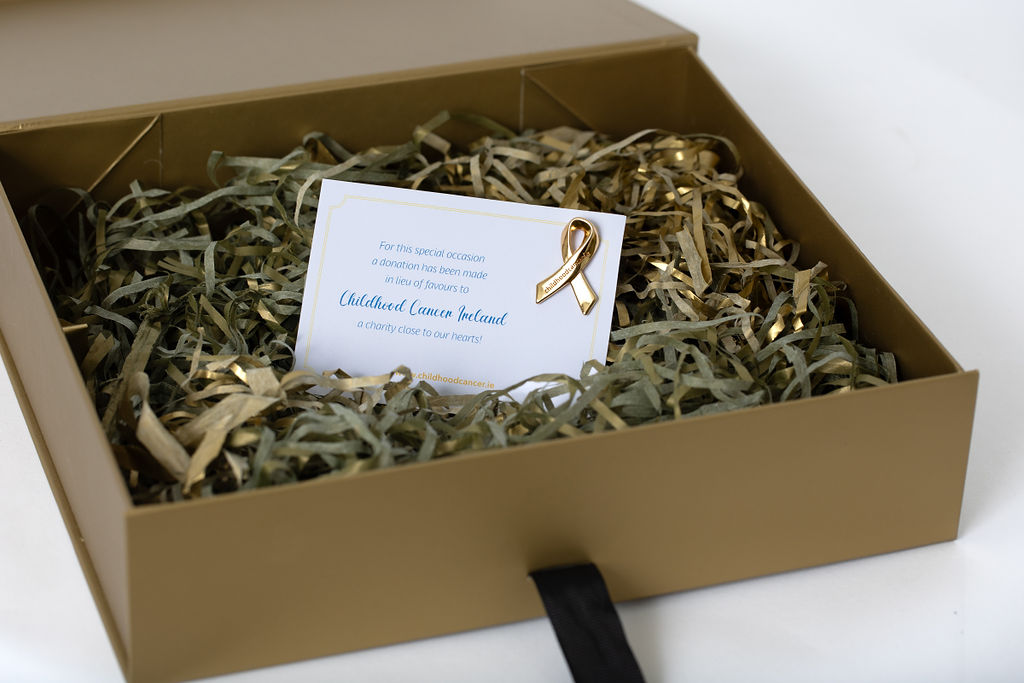By choosing our beautiful and elegant gold ribbon pin as a wedding favour for your guests, you are raising visibility and awareness for children and young people with cancer, survivors and their families.