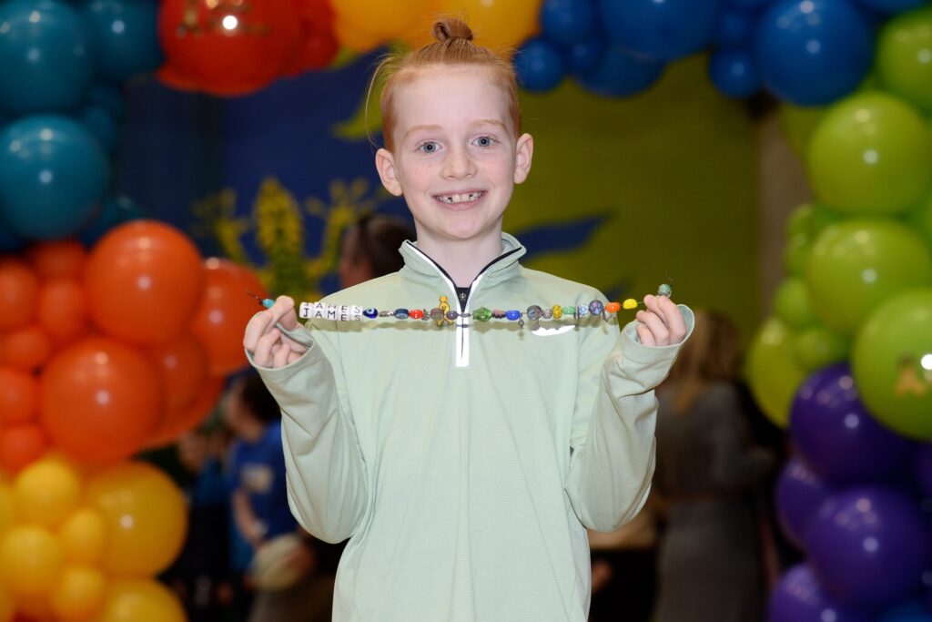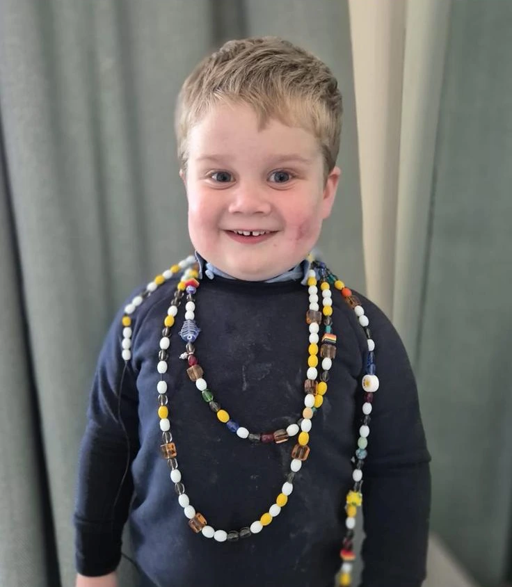 Jude finished treatment in July 2025 and we look at these beads as a reminder of his strength and resilience. Each bead represents a different stage of his treatment for leukaemia, ranging from overnight stays, chemotherapy, x rays, birthdays, injections and more… Jude enjoys wearing this necklace proudly around the house, he may not understand what these mean yet but in time we can explain these symbols correctly. Thank you to all at Childhood Cancer Ireland who make this possible.